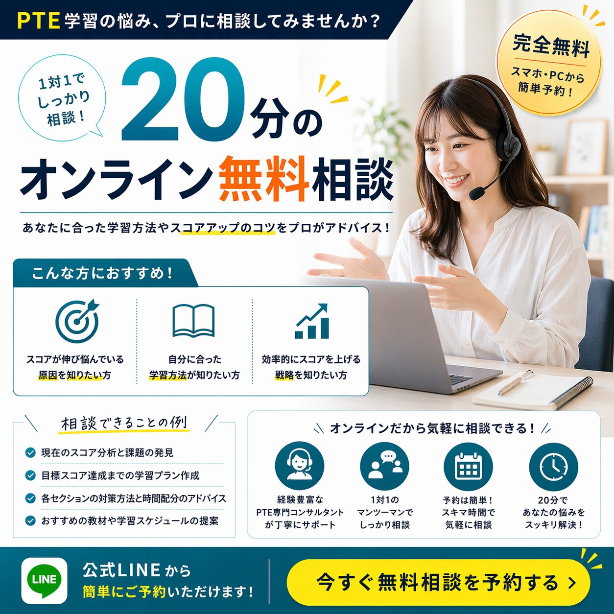 あなたの目標達成をサポートするために、20分間の無料PTE相談を実施中です✅