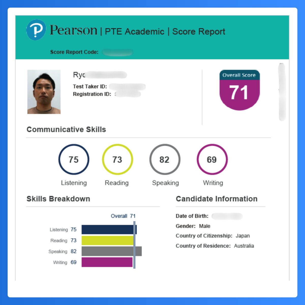 Ryosukeさんは初めてのPTE試験を受験しました。