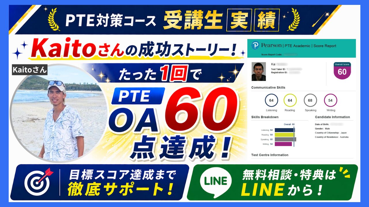 【PTE体験談】Kaitoさんの成功ストーリー!たった1回でPTE OA 60点達成!